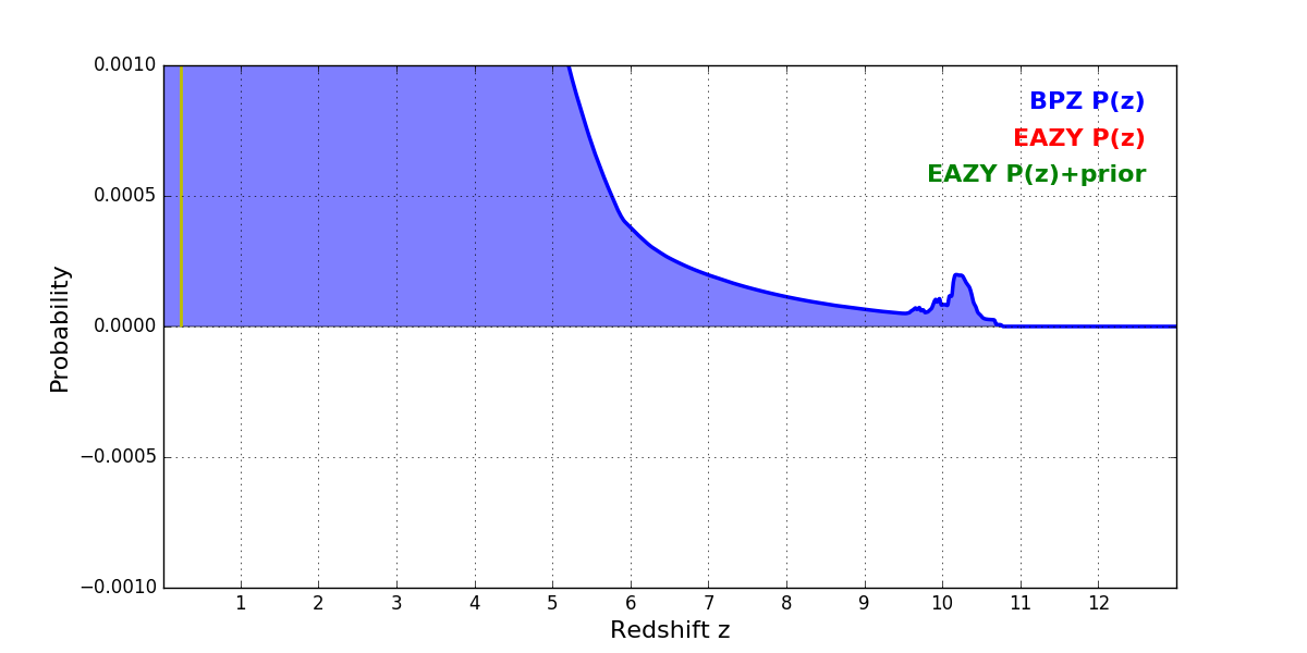 In P(z) plots: Yellow lines mark the cluster redshift z = 0.228,
