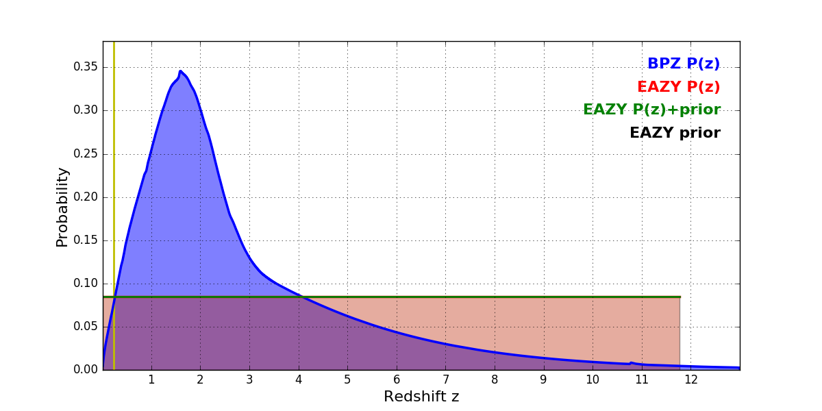 In P(z) plots: Yellow lines mark the cluster redshift z = 0.228,