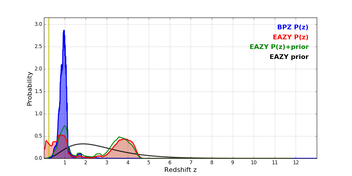 In P(z) plots: Yellow lines mark the cluster redshift z = 0.228,