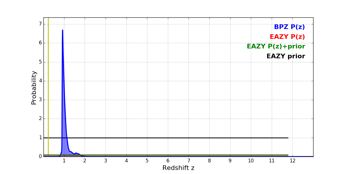 In P(z) plots: Yellow lines mark the cluster redshift z = 0.228,
