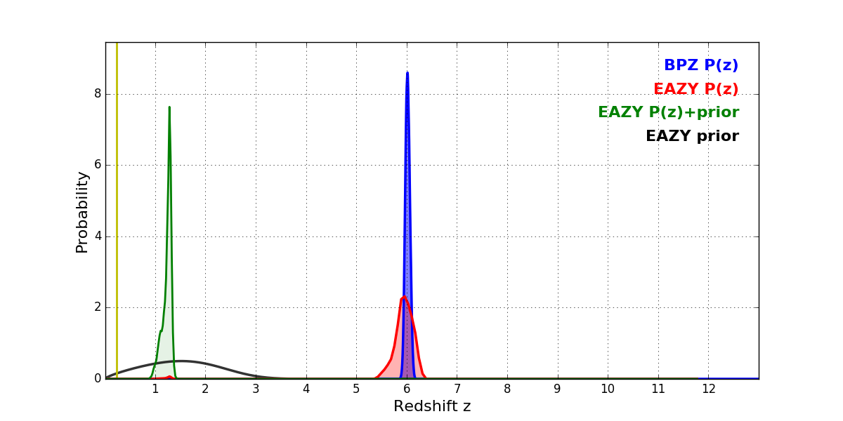 In P(z) plots: Yellow lines mark the cluster redshift z = 0.228,