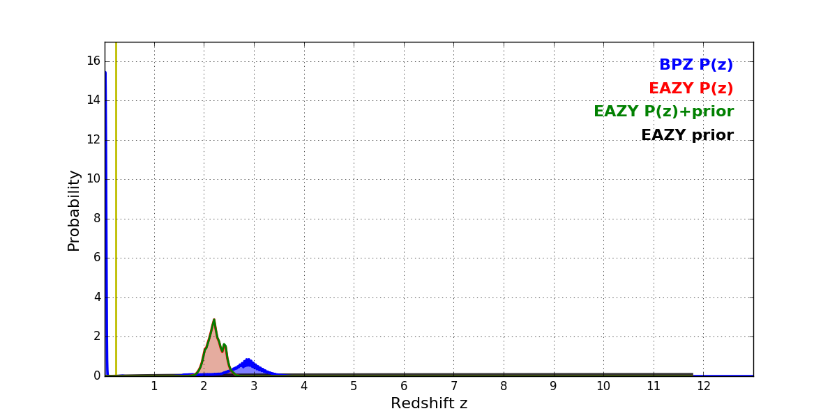 In P(z) plots: Yellow lines mark the cluster redshift z = 0.228,