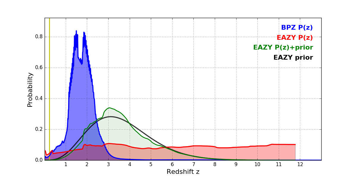 In P(z) plots: Yellow lines mark the cluster redshift z = 0.228,