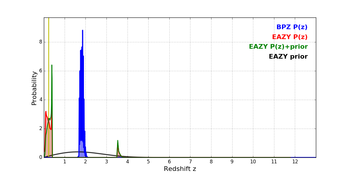 In P(z) plots: Yellow lines mark the cluster redshift z = 0.228,