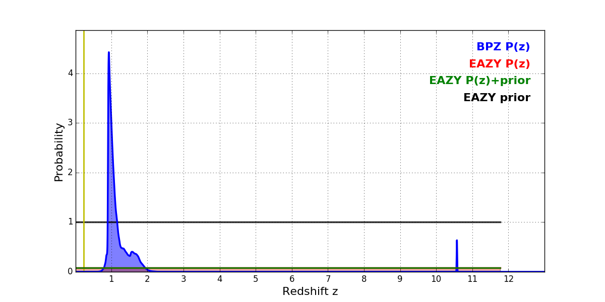 In P(z) plots: Yellow lines mark the cluster redshift z = 0.228,