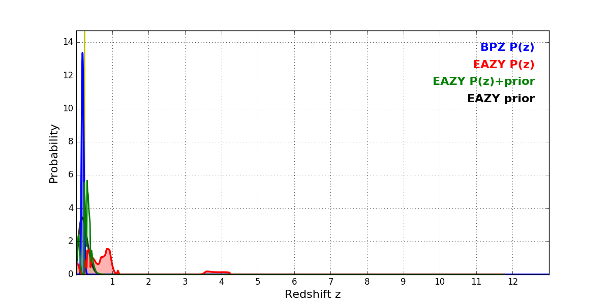 In P(z) plots: Yellow lines mark the cluster redshift z = 0.228,