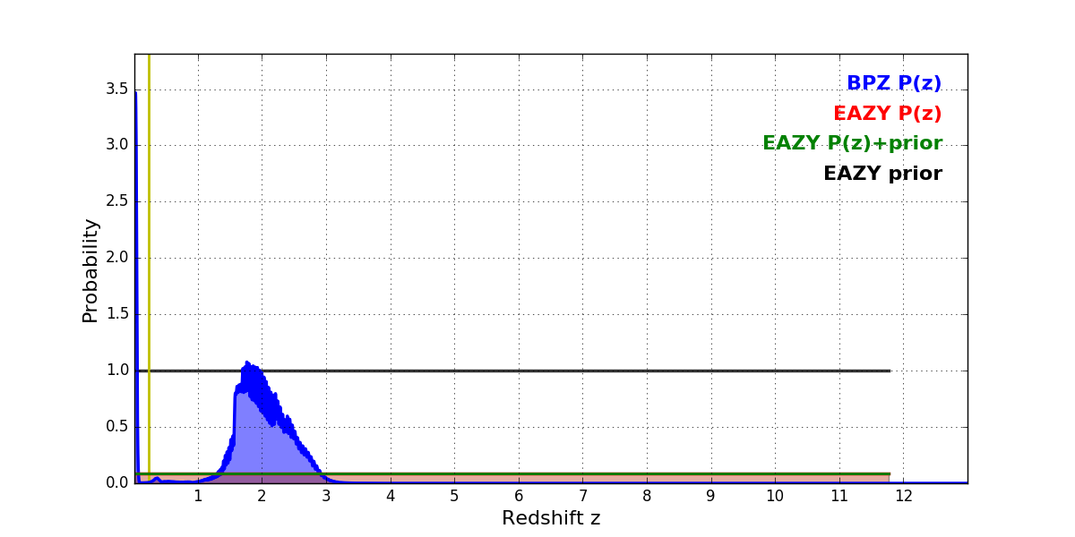 In P(z) plots: Yellow lines mark the cluster redshift z = 0.228,