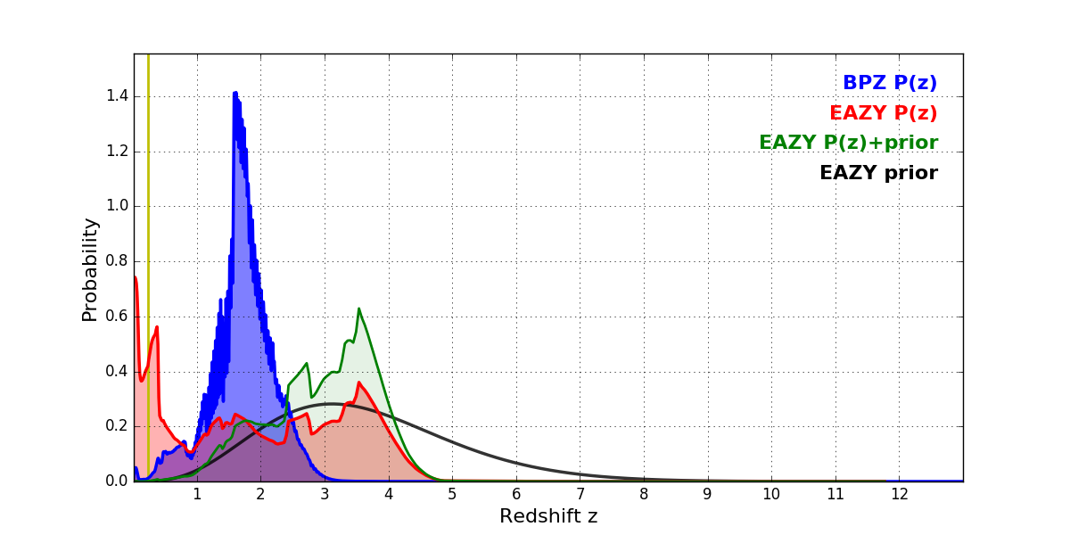 In P(z) plots: Yellow lines mark the cluster redshift z = 0.228,