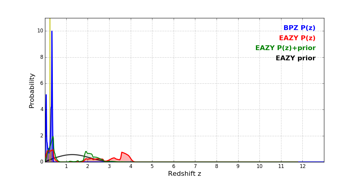 In P(z) plots: Yellow lines mark the cluster redshift z = 0.228,