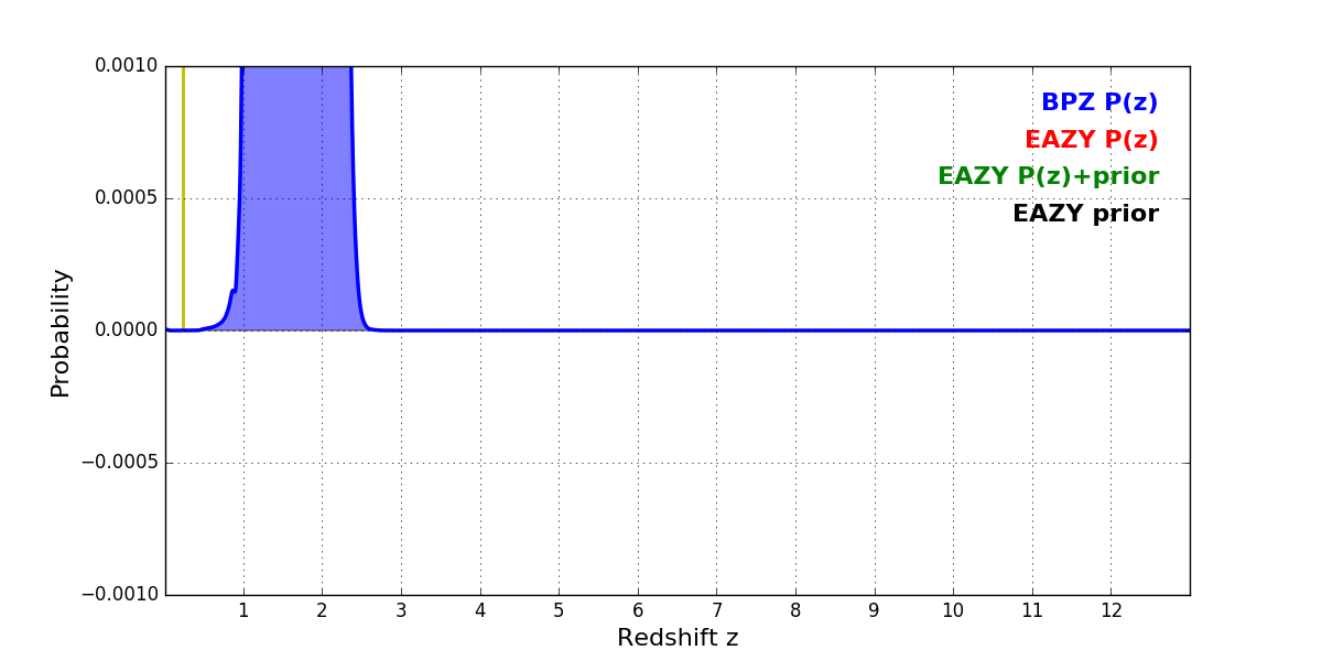 In P(z) plots: Yellow lines mark the cluster redshift z = 0.228,