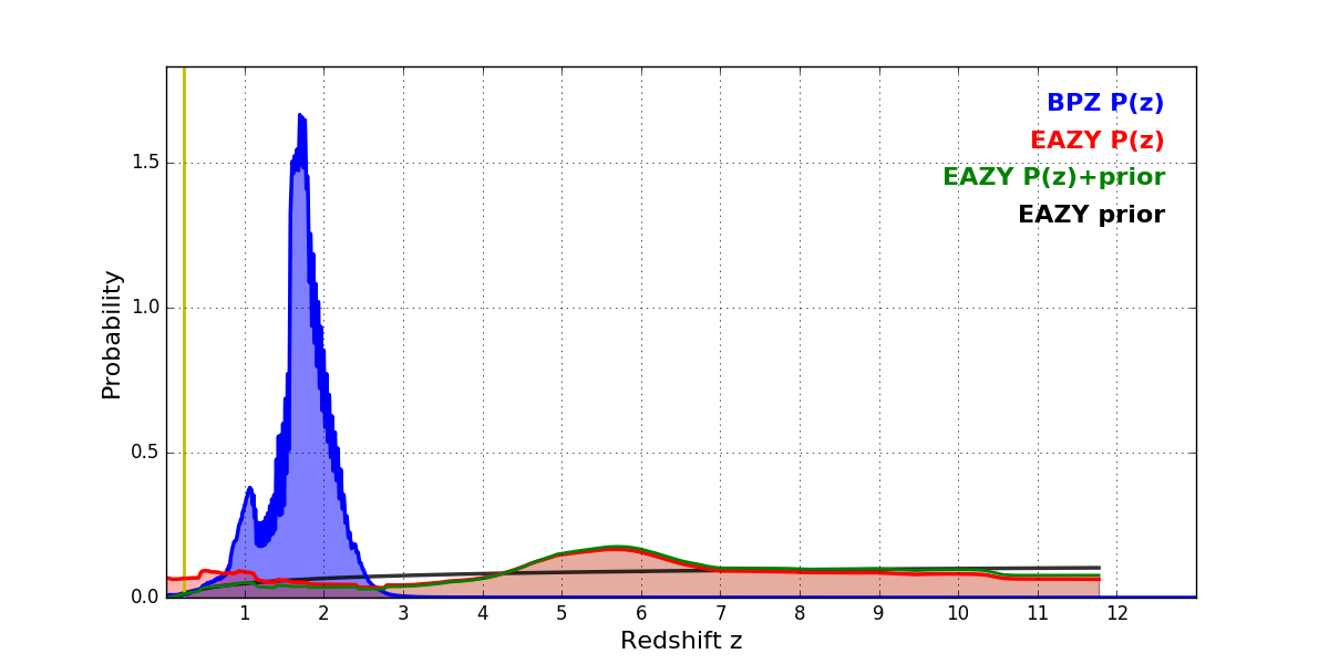 In P(z) plots: Yellow lines mark the cluster redshift z = 0.228,