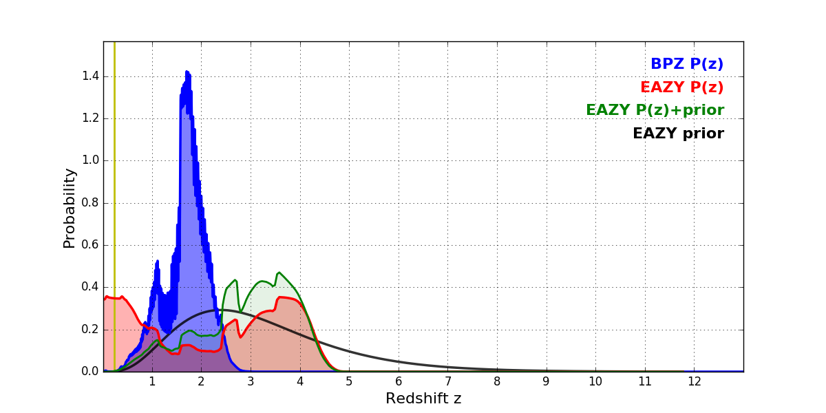 In P(z) plots: Yellow lines mark the cluster redshift z = 0.228,