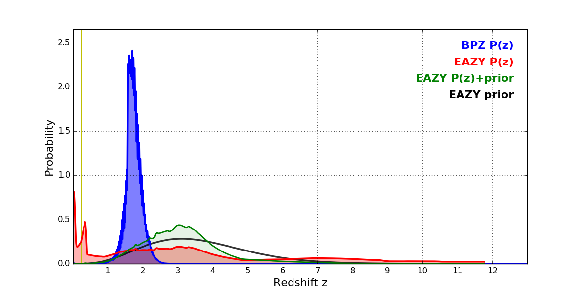 In P(z) plots: Yellow lines mark the cluster redshift z = 0.228,