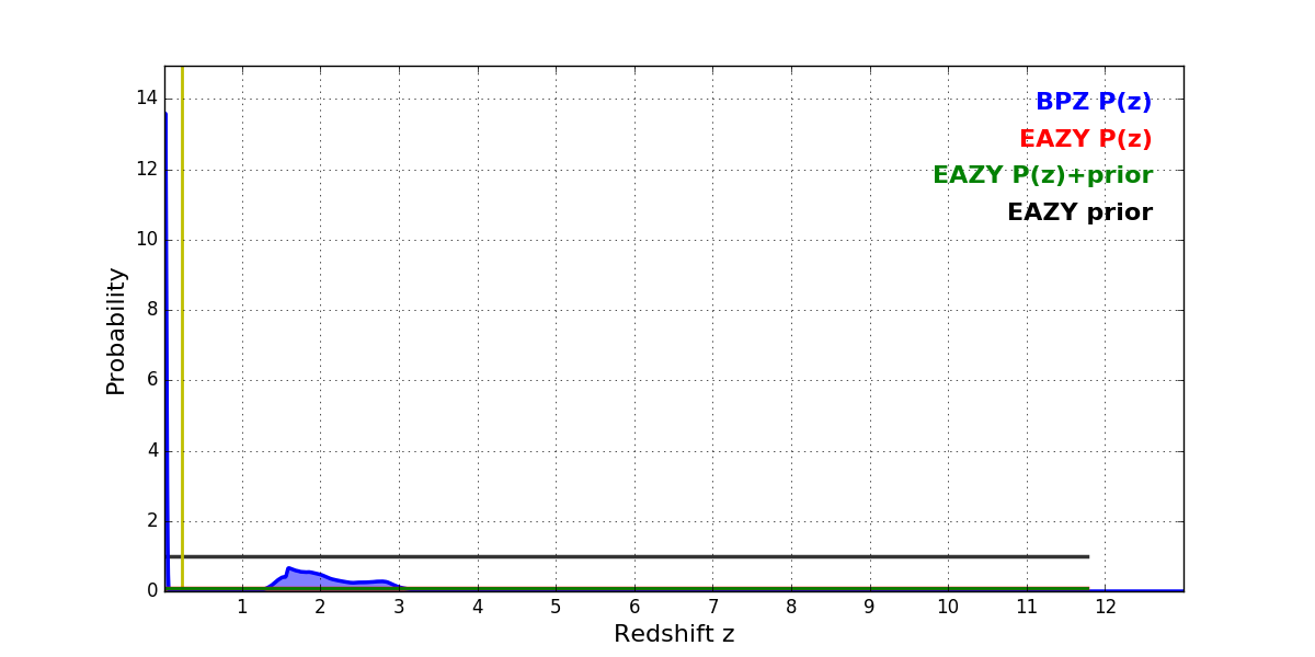 In P(z) plots: Yellow lines mark the cluster redshift z = 0.228,