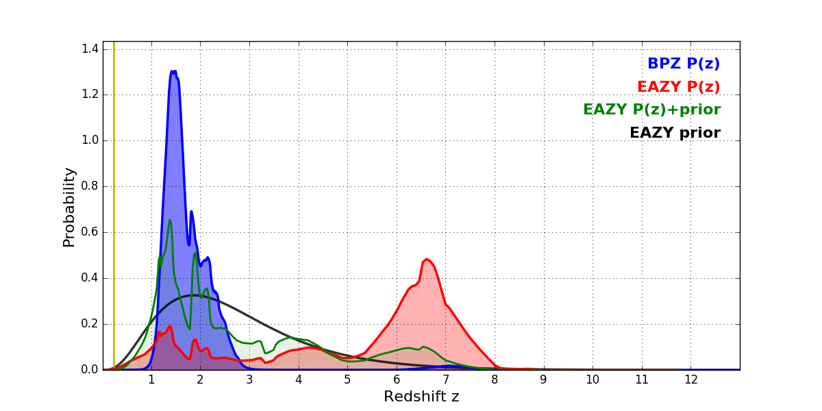 In P(z) plots: Yellow lines mark the cluster redshift z = 0.228,