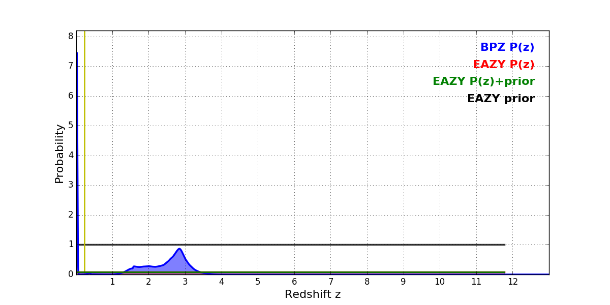 In P(z) plots: Yellow lines mark the cluster redshift z = 0.228,