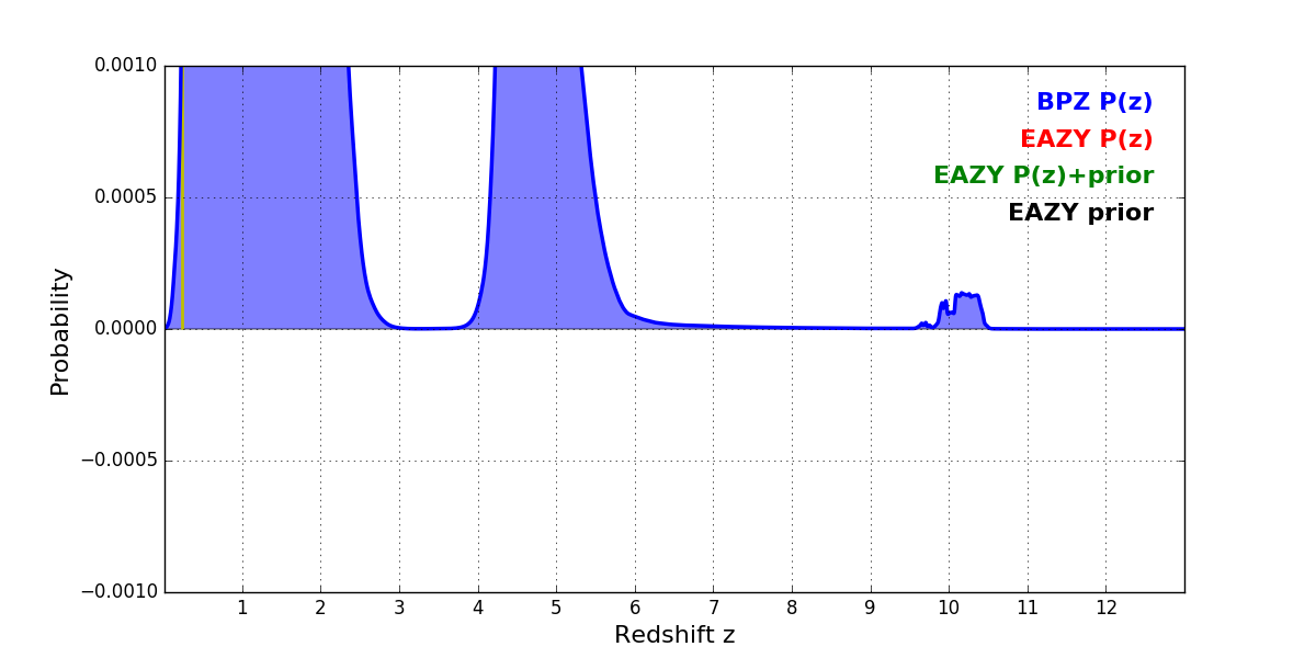 In P(z) plots: Yellow lines mark the cluster redshift z = 0.228,