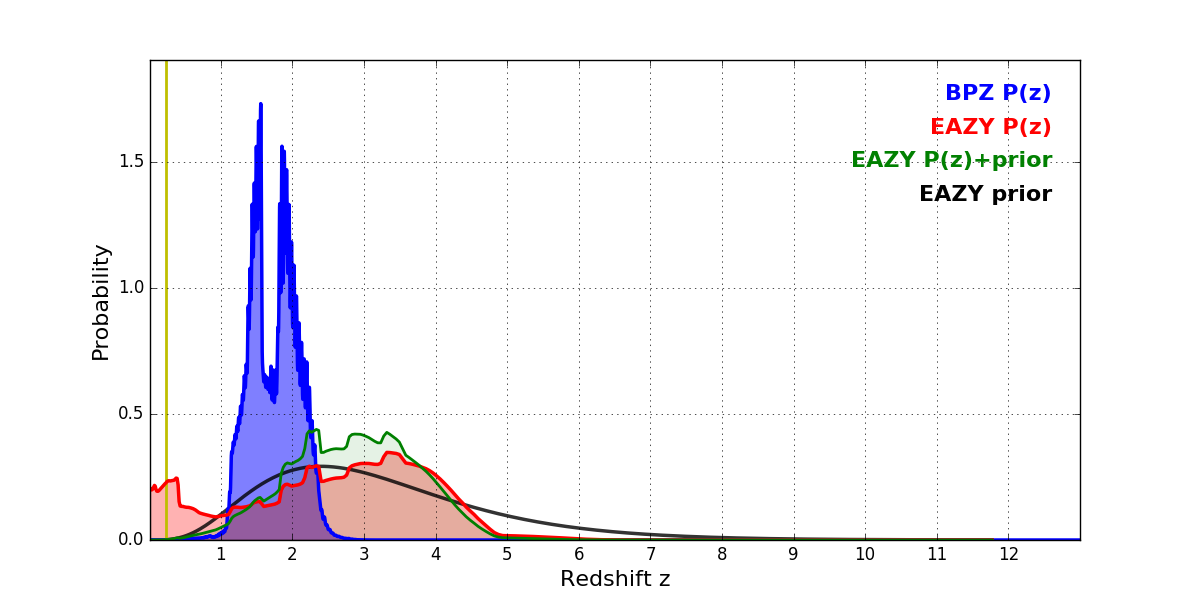 In P(z) plots: Yellow lines mark the cluster redshift z = 0.228,