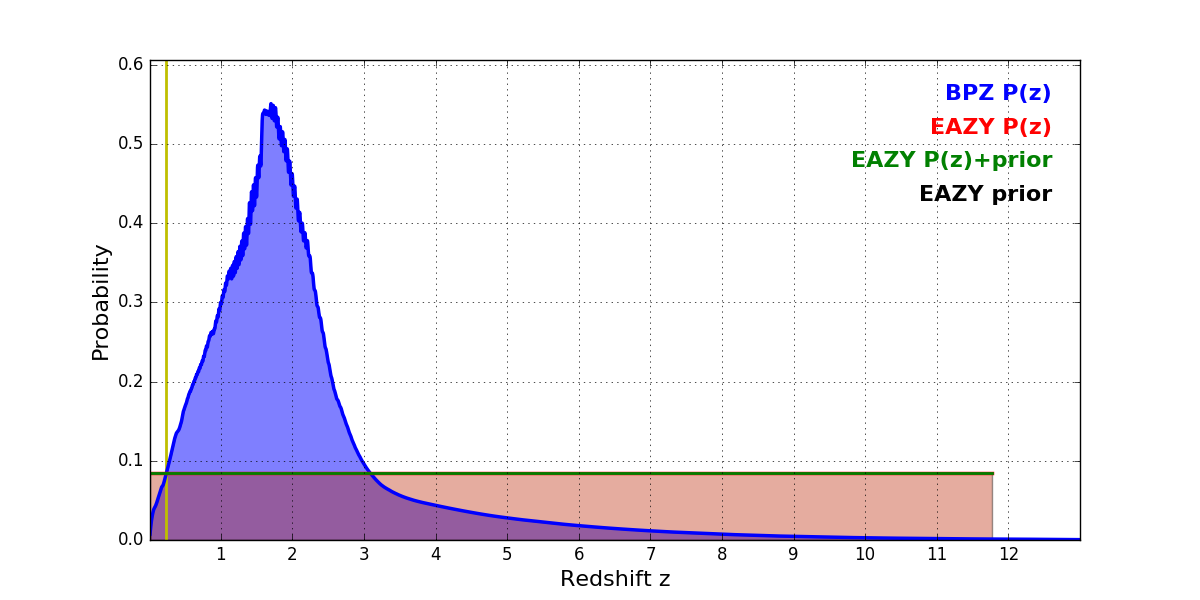 In P(z) plots: Yellow lines mark the cluster redshift z = 0.228,