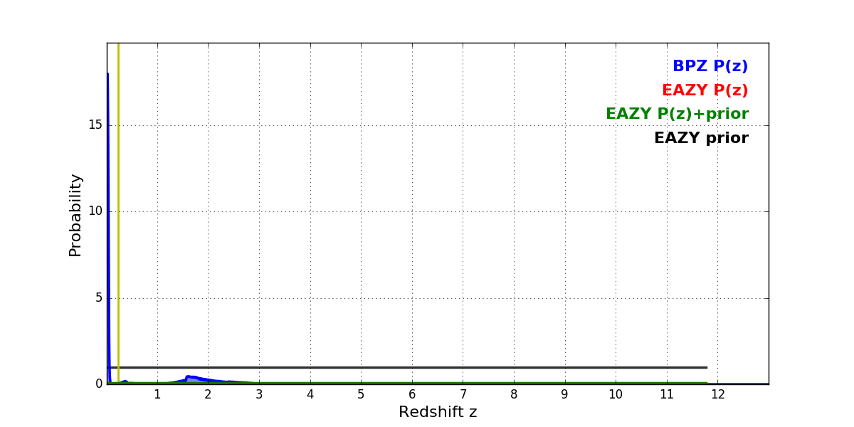 In P(z) plots: Yellow lines mark the cluster redshift z = 0.228,