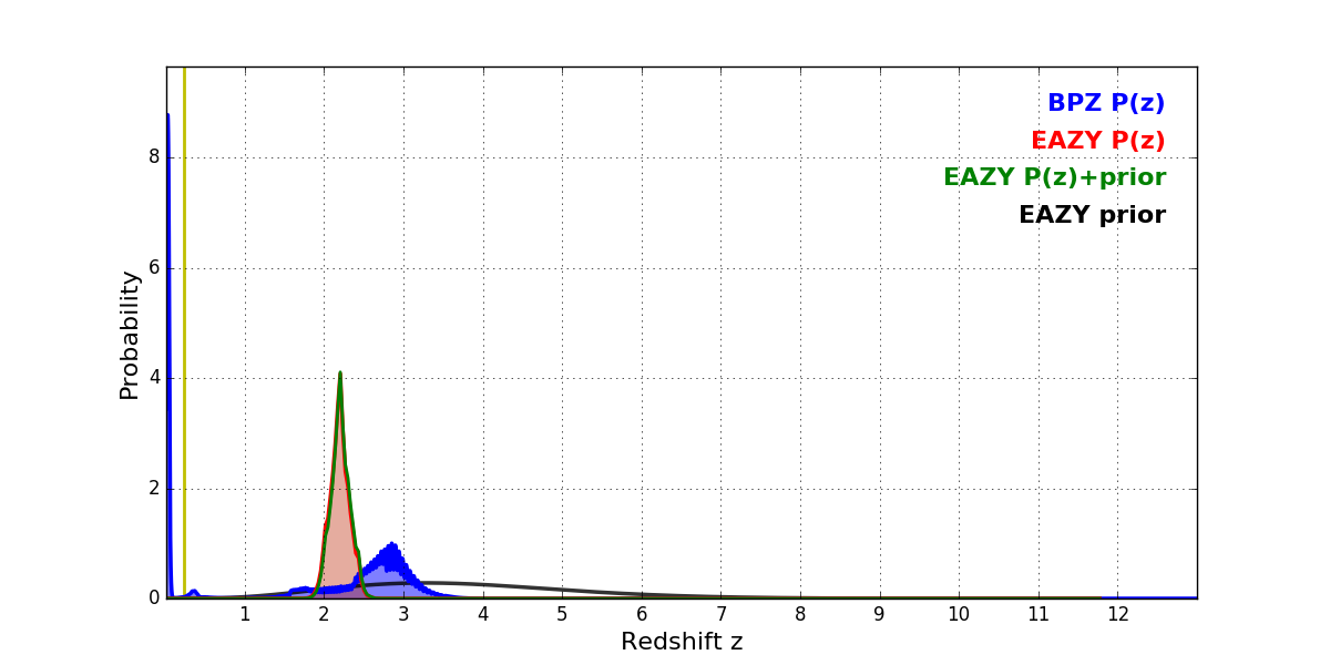 In P(z) plots: Yellow lines mark the cluster redshift z = 0.228,