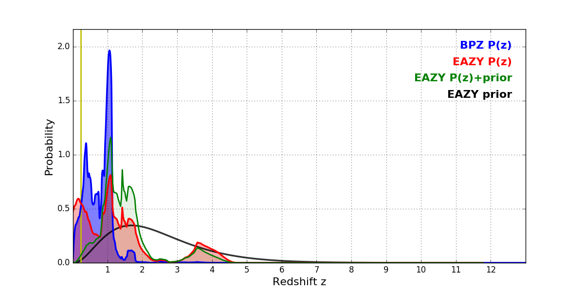 In P(z) plots: Yellow lines mark the cluster redshift z = 0.228,