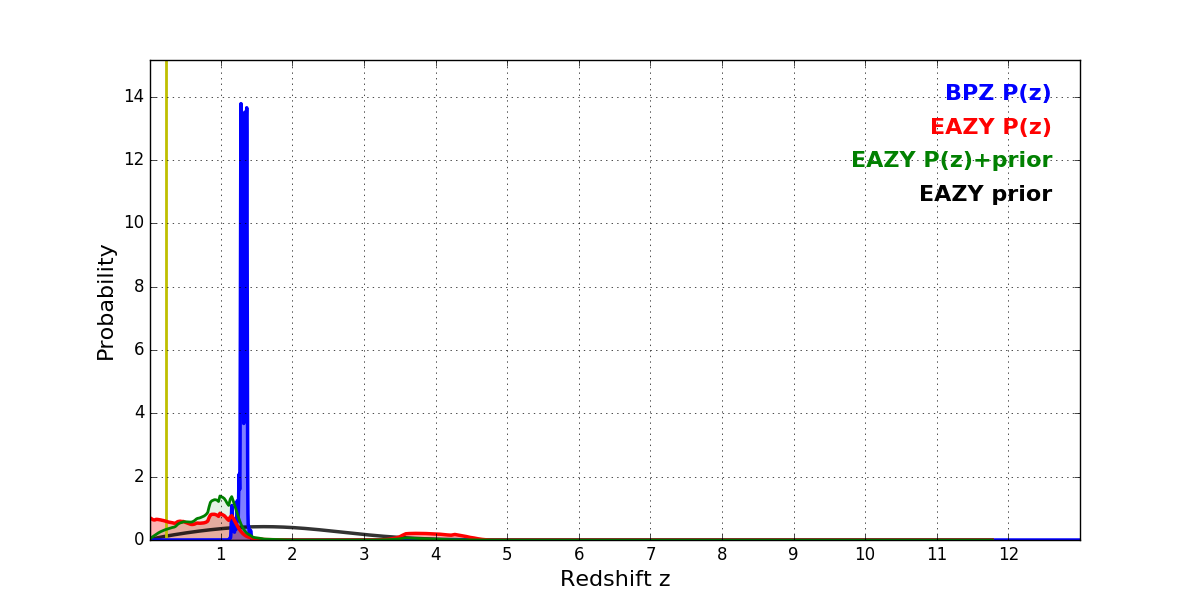 In P(z) plots: Yellow lines mark the cluster redshift z = 0.228,