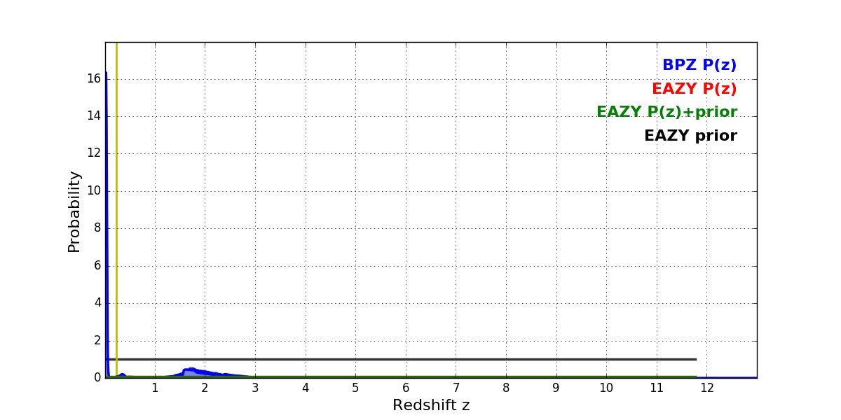 In P(z) plots: Yellow lines mark the cluster redshift z = 0.228,