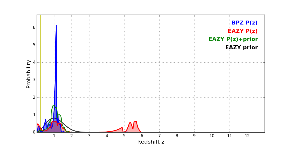 In P(z) plots: Yellow lines mark the cluster redshift z = 0.228,