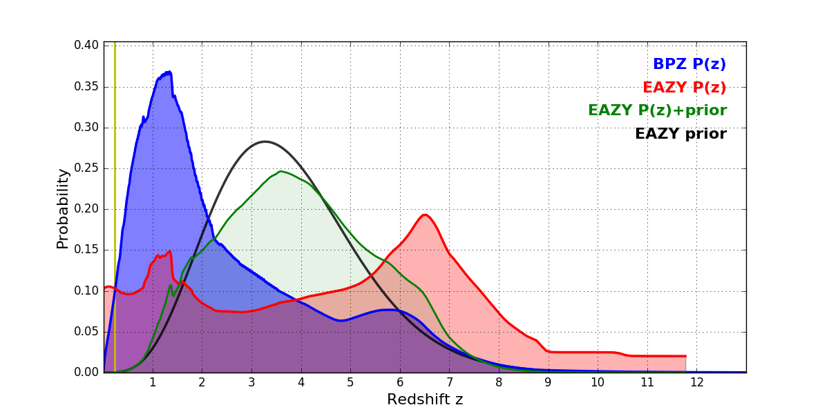 In P(z) plots: Yellow lines mark the cluster redshift z = 0.228,