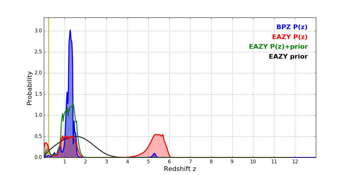 In P(z) plots: Yellow lines mark the cluster redshift z = 0.228,