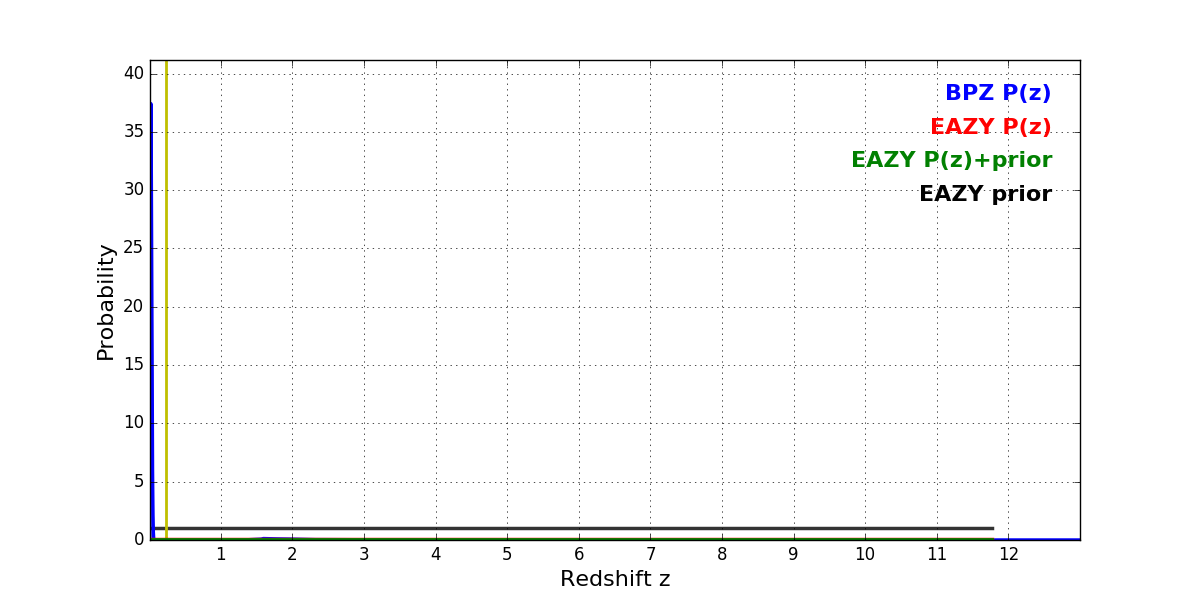 In P(z) plots: Yellow lines mark the cluster redshift z = 0.228,