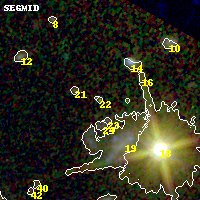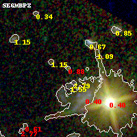 Object #22   x,y = (2036, 3195)   RA, Dec = (02:54:56.592, -58:53:03.12) = (43.73580, -58.88420)   BPZ = 0.877 [0.454--8.164]   type = 7.20 (Scd_B10 - SB1_B10)   stellarity = 0.77   chisq2 = 57.28   ODDS = 0.15   z_cluster = 0.438