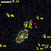 Object #2410   x,y = (1719, 1961)   RA, Dec = (02:54:59.040, -58:54:17.28) = (43.74600, -58.90480)   BPZ = 2.254 [0.233--3.213]   type = 10.70 (SB11_A_0_l - SB3_B10)   stellarity = 0.36   chisq2 = 0.55   ODDS = 0.18   z_cluster = 0.438