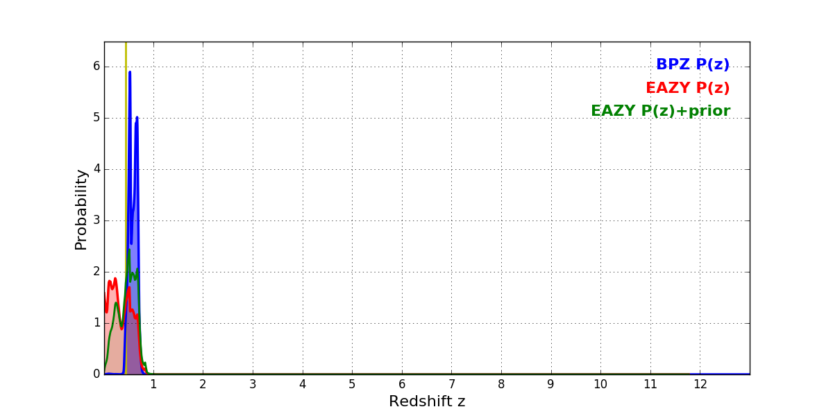 In P(z) plots: Yellow lines mark the cluster redshift z = 0.438,