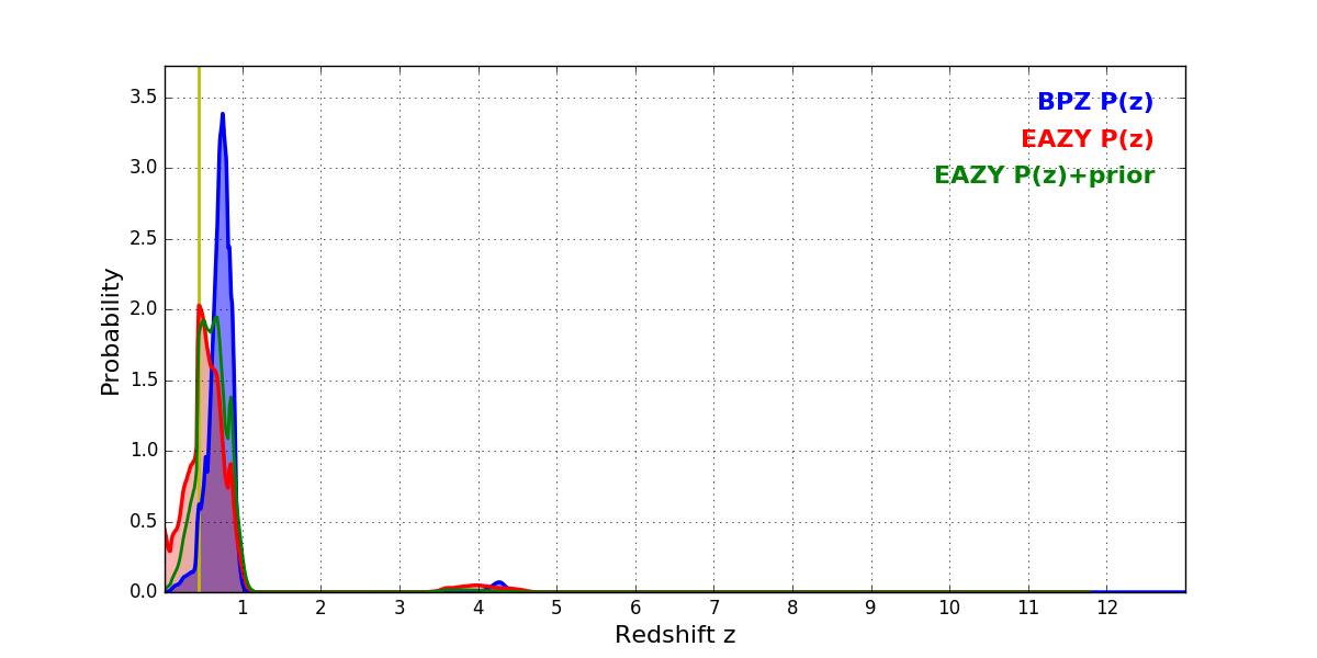 In P(z) plots: Yellow lines mark the cluster redshift z = 0.438,