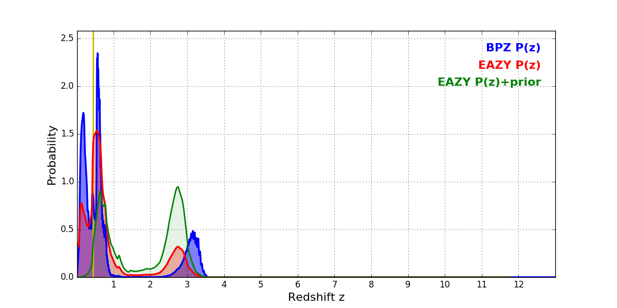 In P(z) plots: Yellow lines mark the cluster redshift z = 0.438,
