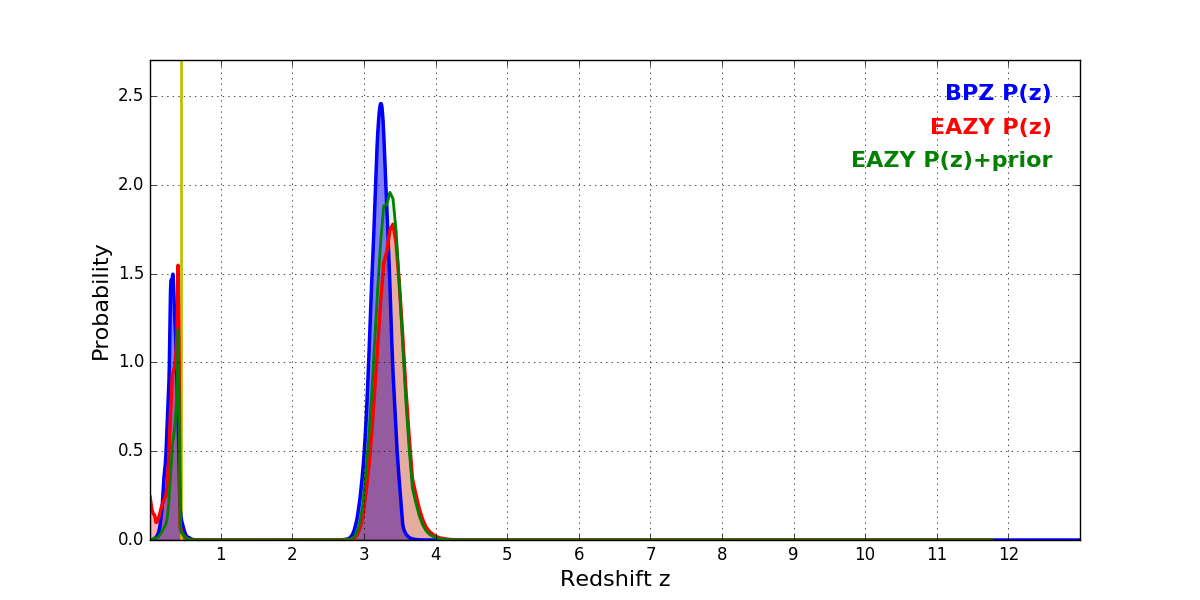 In P(z) plots: Yellow lines mark the cluster redshift z = 0.438,
