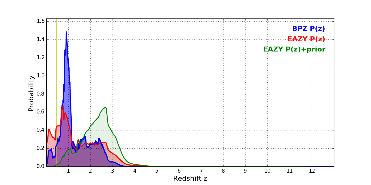 In P(z) plots: Yellow lines mark the cluster redshift z = 0.438,