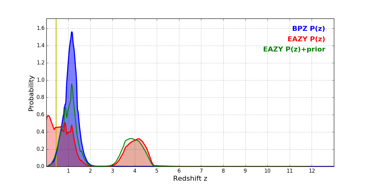 In P(z) plots: Yellow lines mark the cluster redshift z = 0.438,