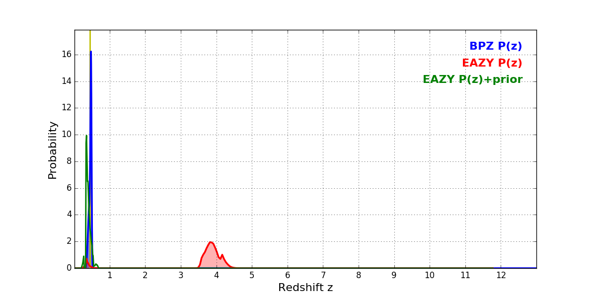 In P(z) plots: Yellow lines mark the cluster redshift z = 0.438,