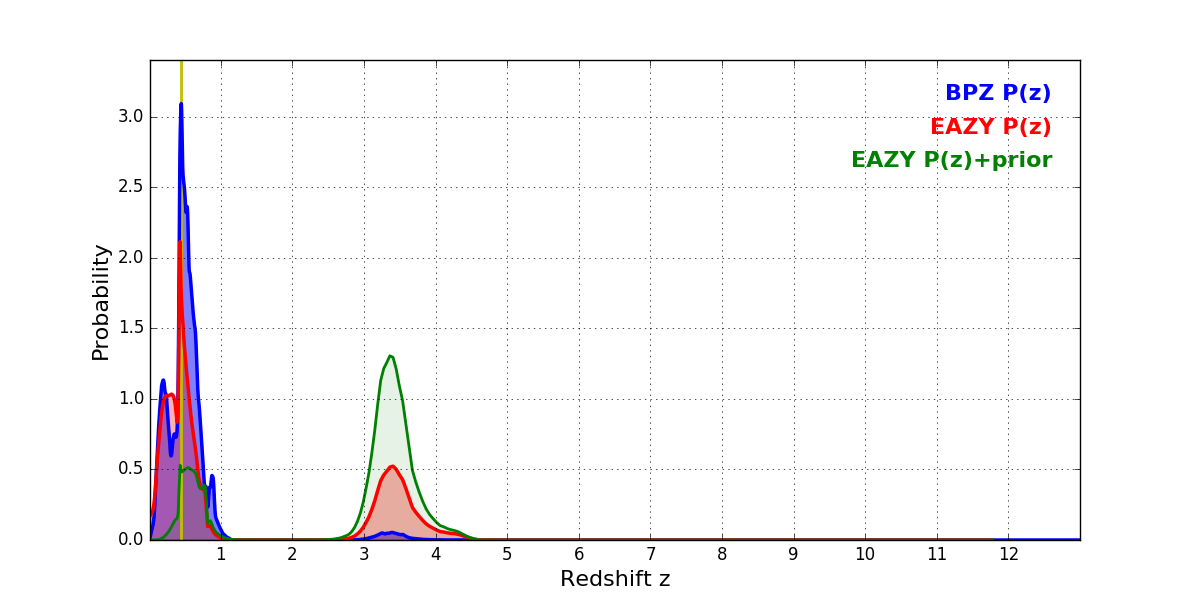 In P(z) plots: Yellow lines mark the cluster redshift z = 0.438,
