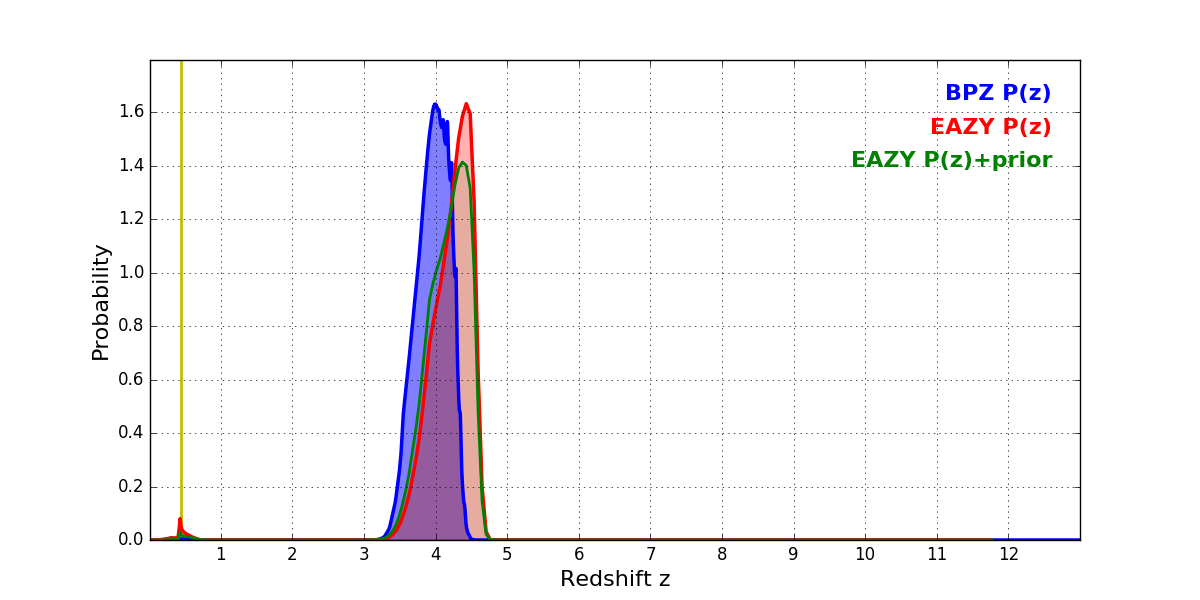 In P(z) plots: Yellow lines mark the cluster redshift z = 0.438,