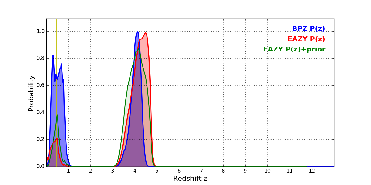 In P(z) plots: Yellow lines mark the cluster redshift z = 0.438,