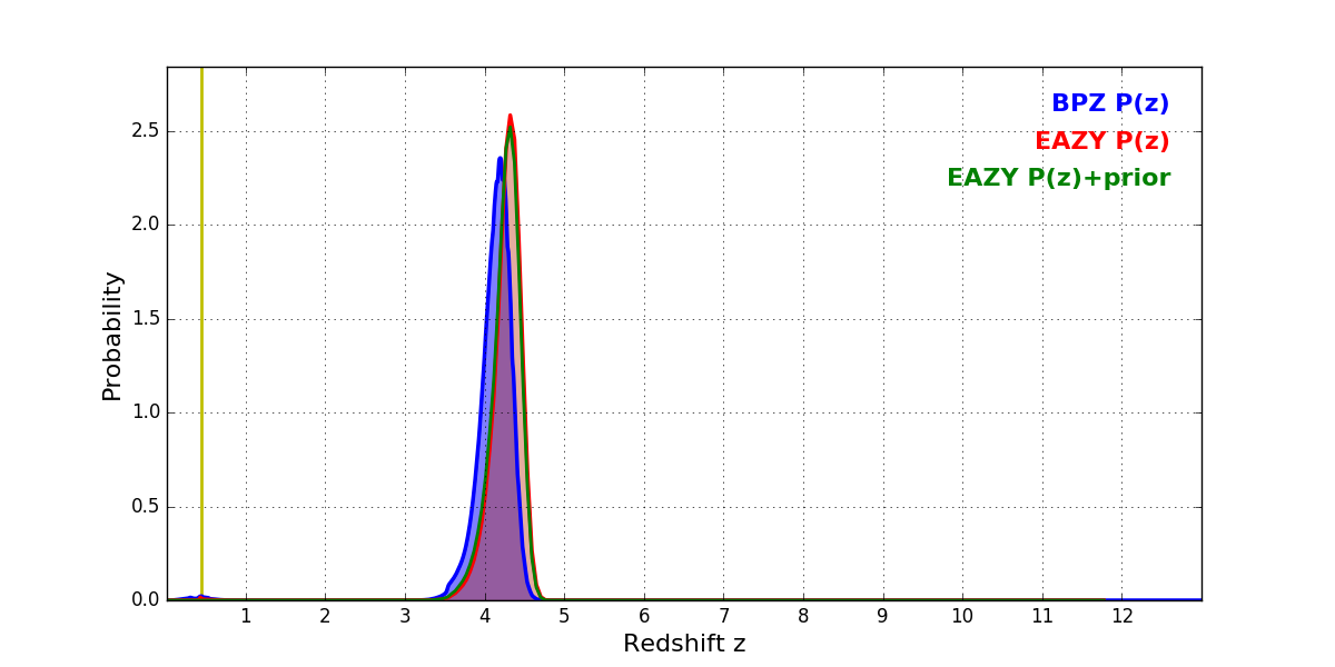 In P(z) plots: Yellow lines mark the cluster redshift z = 0.438,