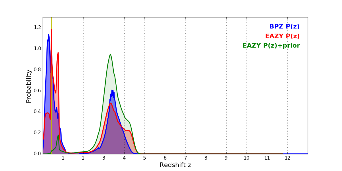 In P(z) plots: Yellow lines mark the cluster redshift z = 0.438,