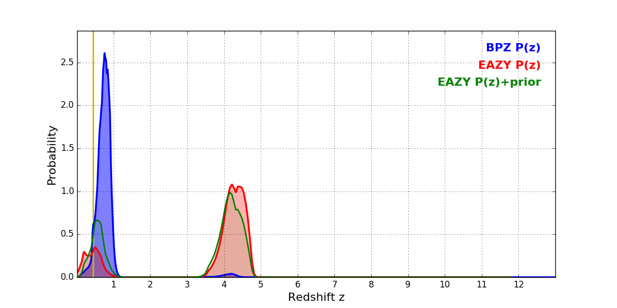 In P(z) plots: Yellow lines mark the cluster redshift z = 0.438,