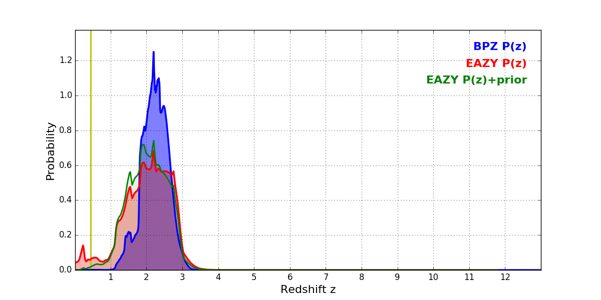 In P(z) plots: Yellow lines mark the cluster redshift z = 0.438,