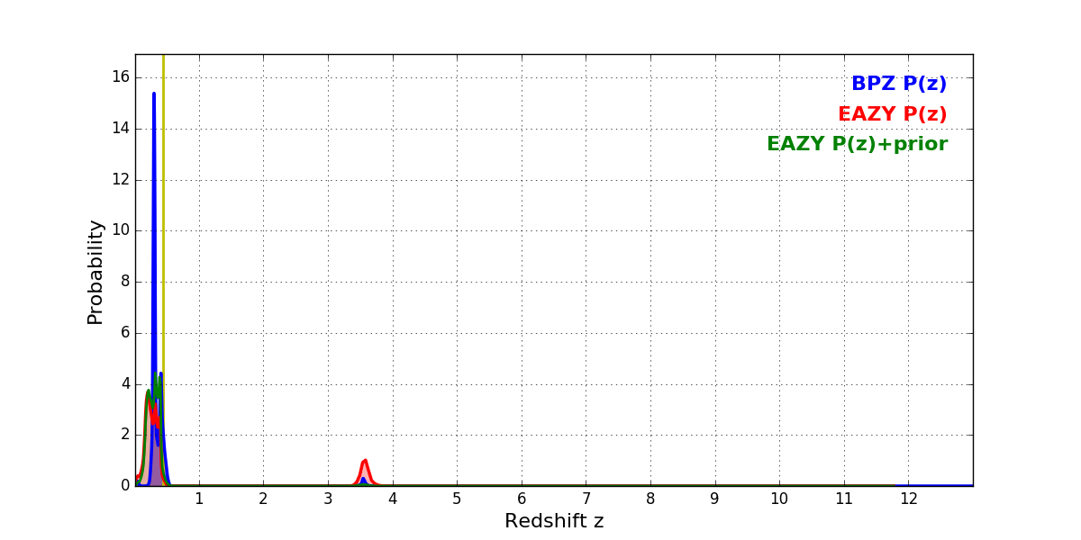 In P(z) plots: Yellow lines mark the cluster redshift z = 0.438,
