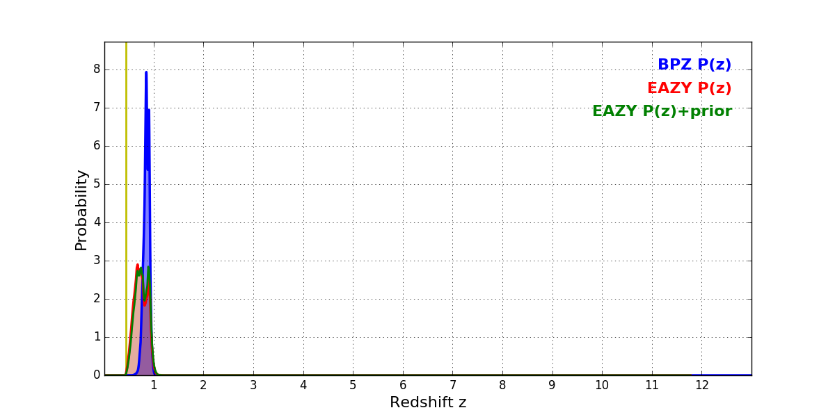 In P(z) plots: Yellow lines mark the cluster redshift z = 0.438,